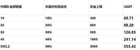 中国队获得第18、28、38、48、58块金牌时,当日投注SHABA及IM体育赛事,如产生负盈利,次日可获得指定百分比回馈
