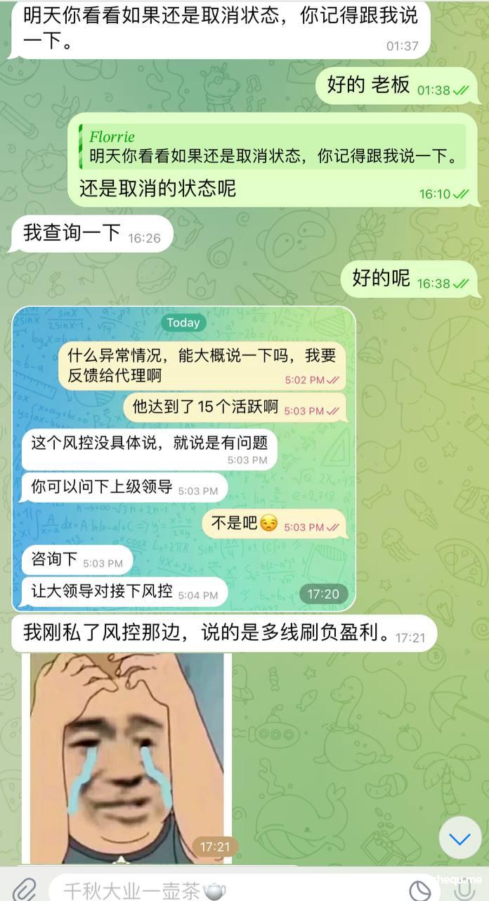 9月注册的代理线 朋友那边的大哥玩的 本身大哥在那边线就输了小百万了,不太想玩了 就换到我这边 也是输钱的 朋友那边线就没玩了, 只是10月红了2000U 朋友那边红了2000U 一共不到4000U 但是代理线负盈利9月 1.6万U 直接给我取消了